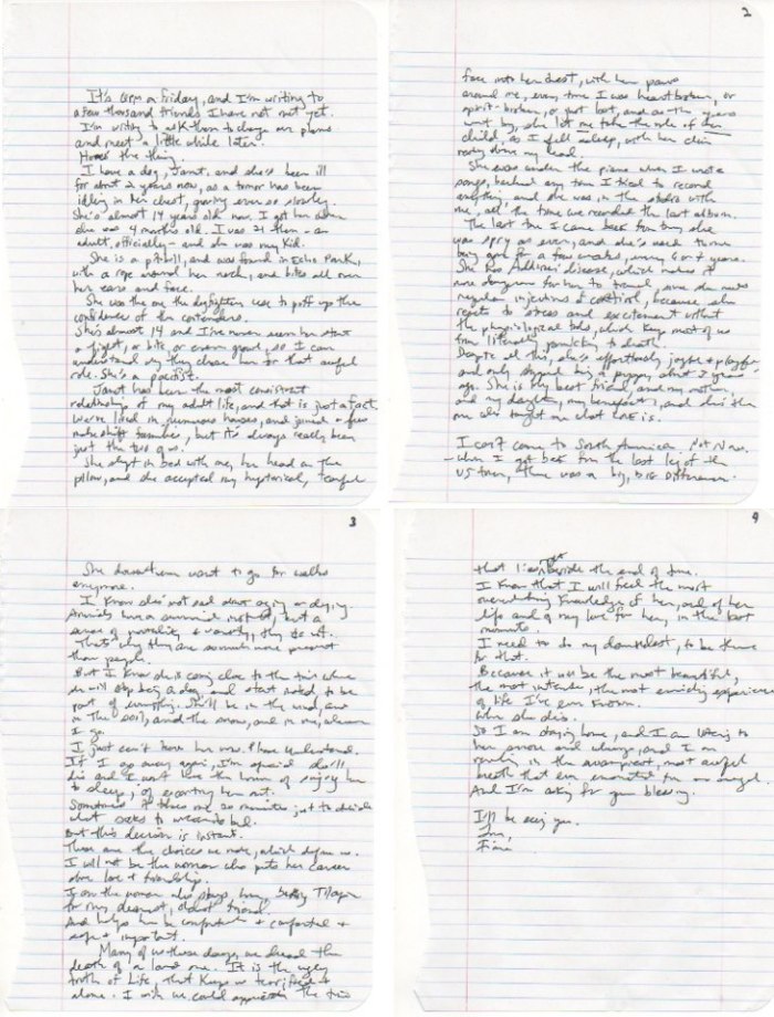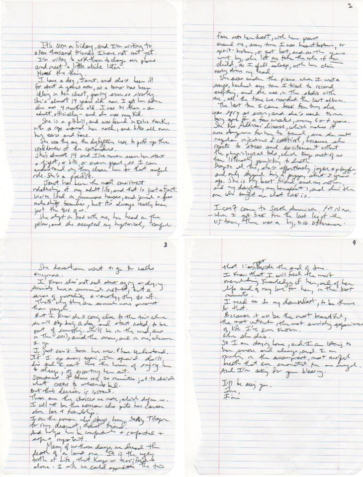 El día de hoy Fiona Apple publicó tanto en su sitio oficial como en su Facebook, una carta dirigida a sus miles de fans sudamericanos pidiendo comprensión y bendiciones ya que la salud de su perrita Janet, quien la ha acompañado por más de 14 años, se encuentra delicada de salud y posiblemente muera pronto, por lo que Fiona ha decidido posponer su gira para despedir a su mejor amiga con una última tonada.